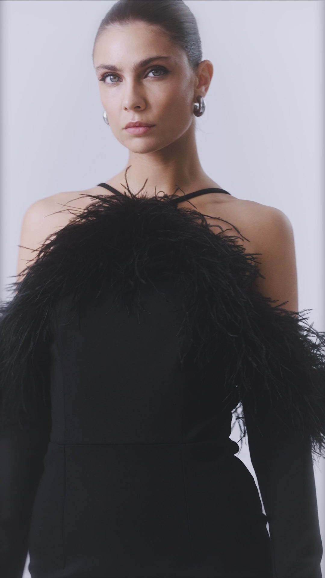 Κοντό μαύρο φόρεμα με φτερά στρουθοκάμηλου, από ελαστικό ύφασμα πούντο. Κλείνει πίσω με φερμουάρ.