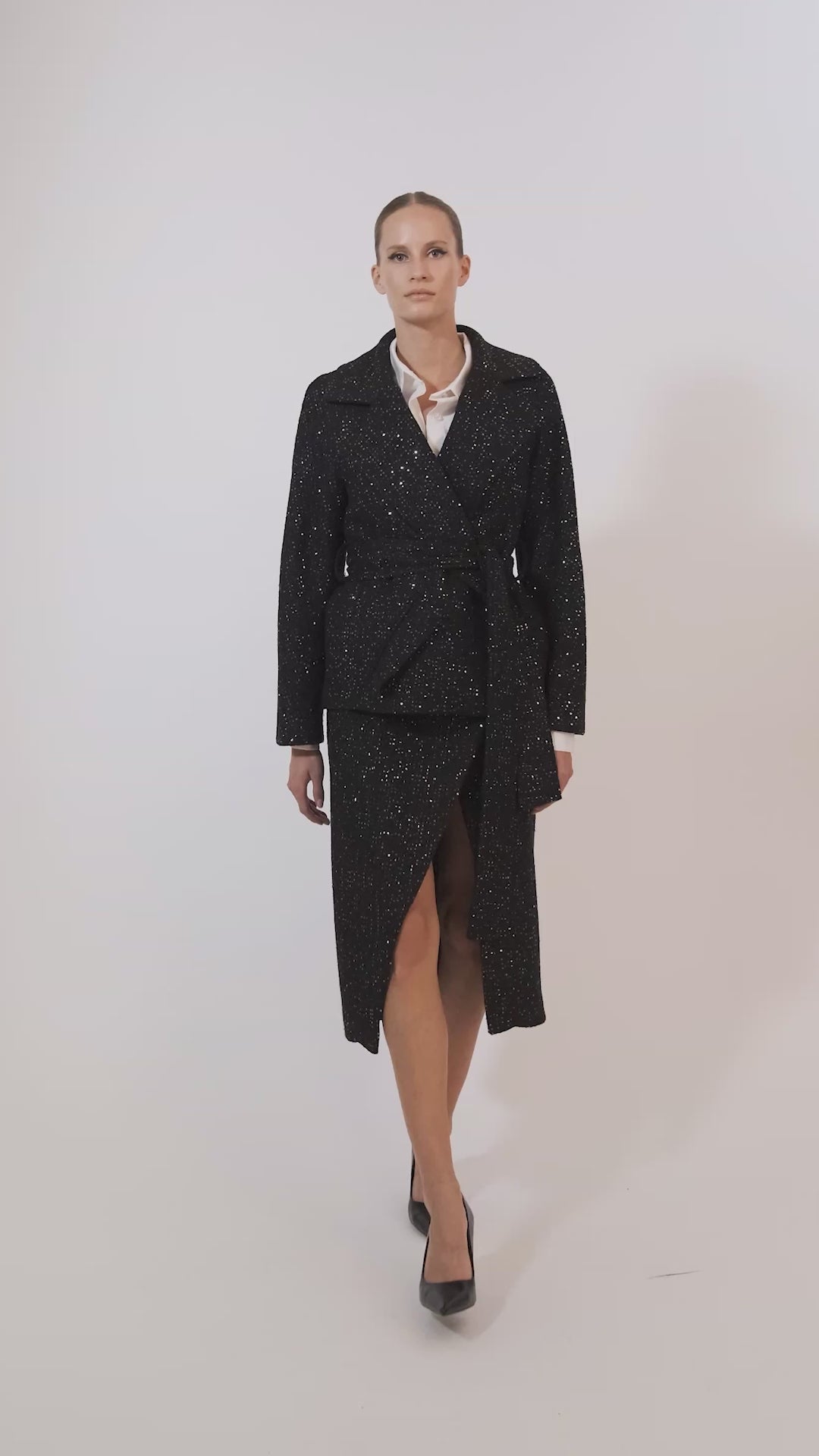 A tailored blazer in tweed is a classic and stylish outerwear piece known for its timeless appeal and sophistication. The fabric is warm, durable with a shiny ending. It has open sleeves and a belt from the same fabric.
