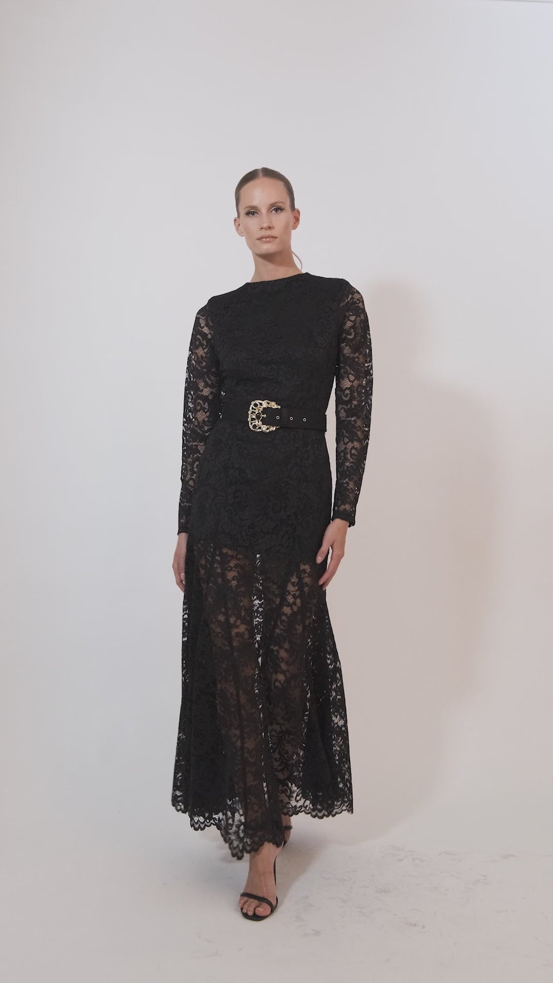 Αυτό το μάξι φόρεμα είναι κυρίως από δαντέλα με εσωτερικό μίνι φόρεμα. Έχει μακριά μανίκια και μεγάλη φούστα. Κλείνει στην πλάτη με φερμουάρ.