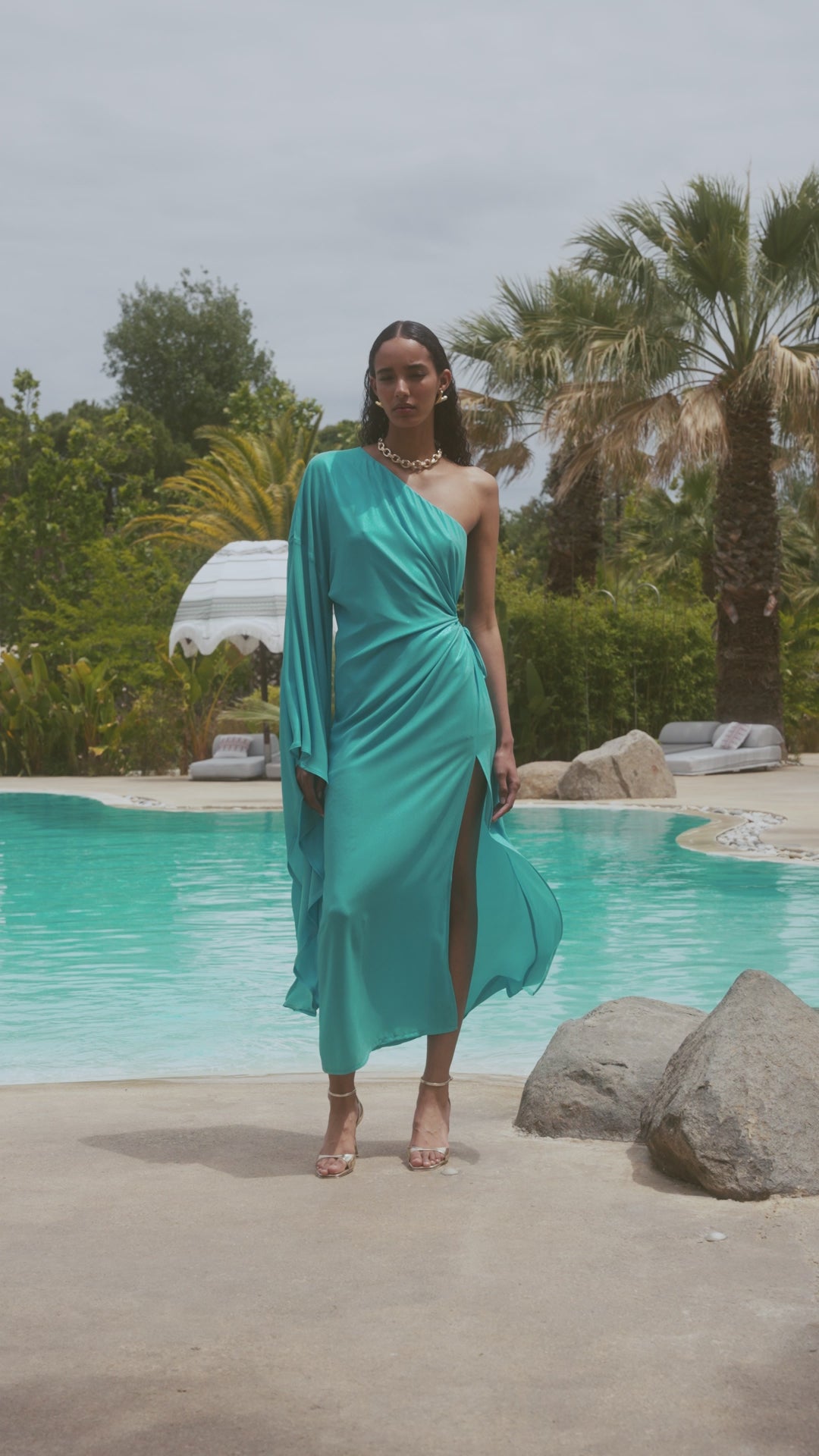 One-Sleeve Dress in Metallic Georgette Turquoise