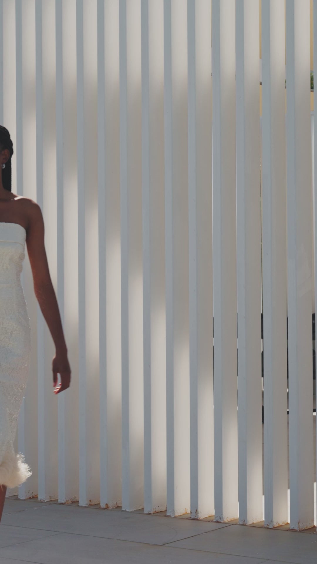Strapless lace dress with feather detail at the hem and pencil silhouette.