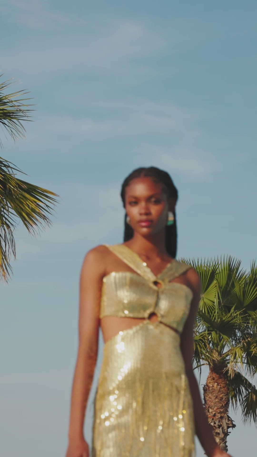 .Φόρεμα με παγιέτες, κρόσσια και ανοιχτή πλάτη.