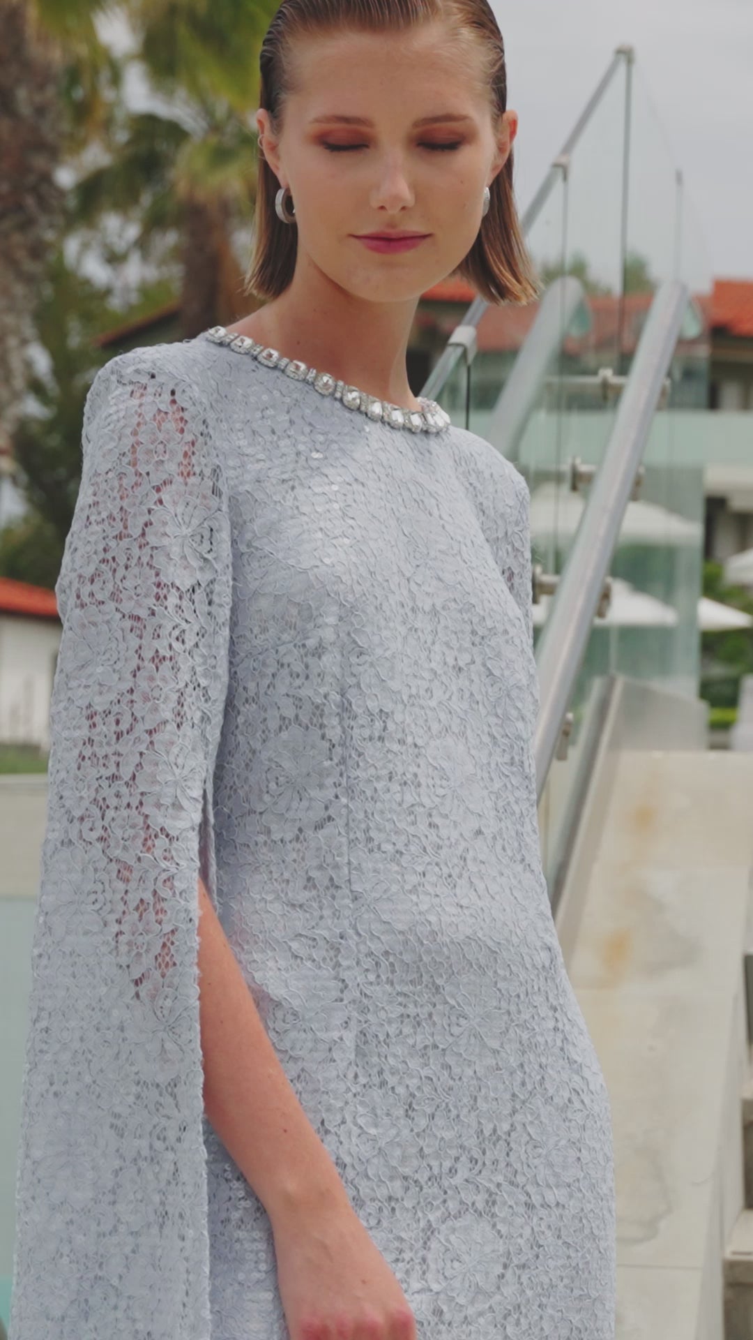 Φόρεμα με μακριά ανοιχτά μανίκια και διακοσμημένο με κρύσταλλα στην λαιμόκοψη. Κλείνει πίσω με φερμουάρ, από ύφασμα δαντέλα με παγιέτες.