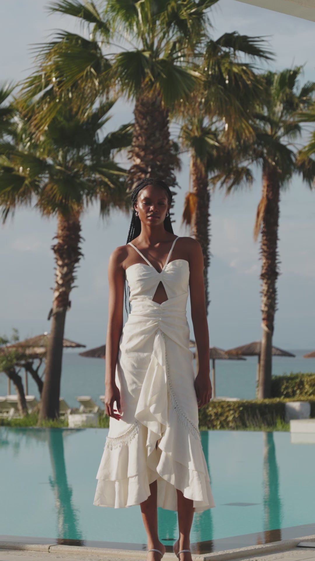 Φόρεμα με βολάν και λεπτομέρειες από κρόσια με στρας, κατασκευασμένο από λινό ύφασμα.