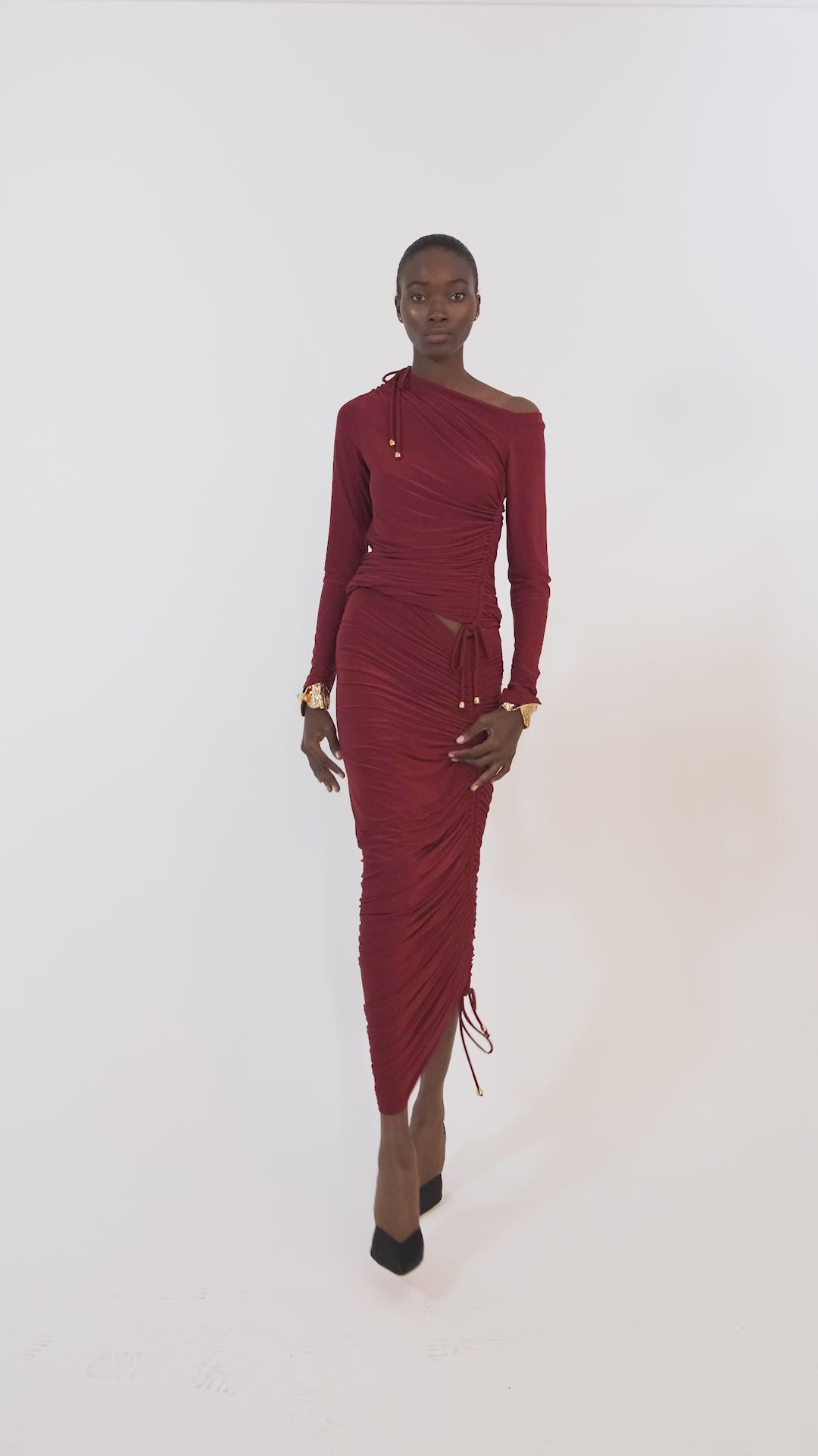 Μια ελαστική και άνετη μπλούζα με έναν ώμο. Είναι μακρυμάνικη, με σούρες παντού και ρυθμιζόμενα κορδόνια με χρυσές λεπτομέρειες.