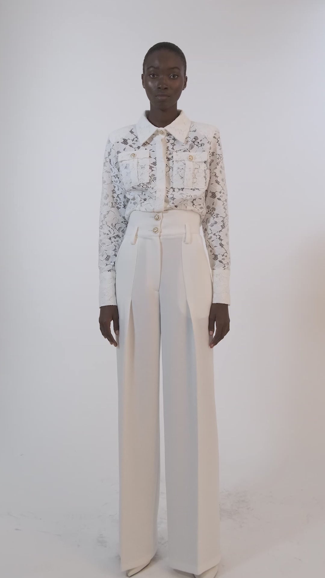 These bell trousers have a straight or relaxed fit, avoiding excessively tight or overly loose style. This allows for comfort and ease of movement while maintaining a streamlined look. They are highwaisted, have a front crease and fasten with zipper and two buttons on the front.
