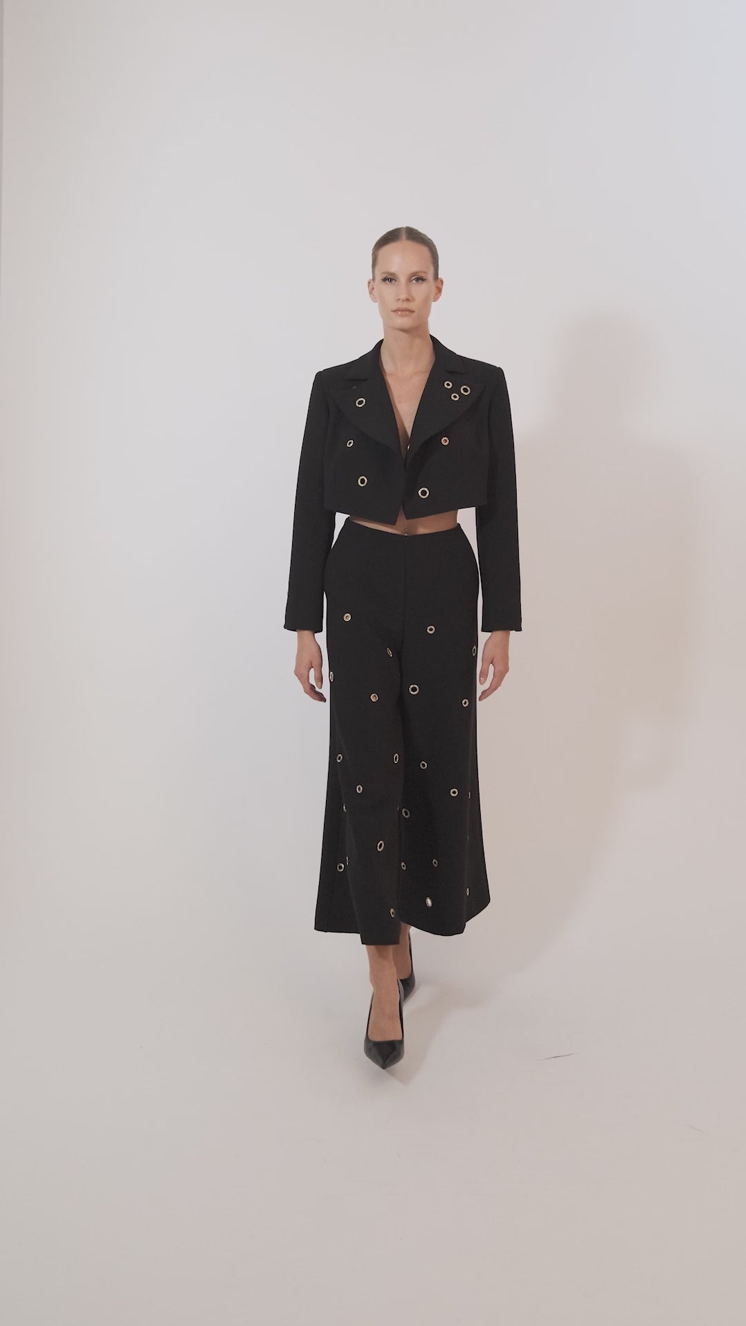 These trousers are so outstanding, but also comfy. They are high-waisted and wide with golden rings as detail.