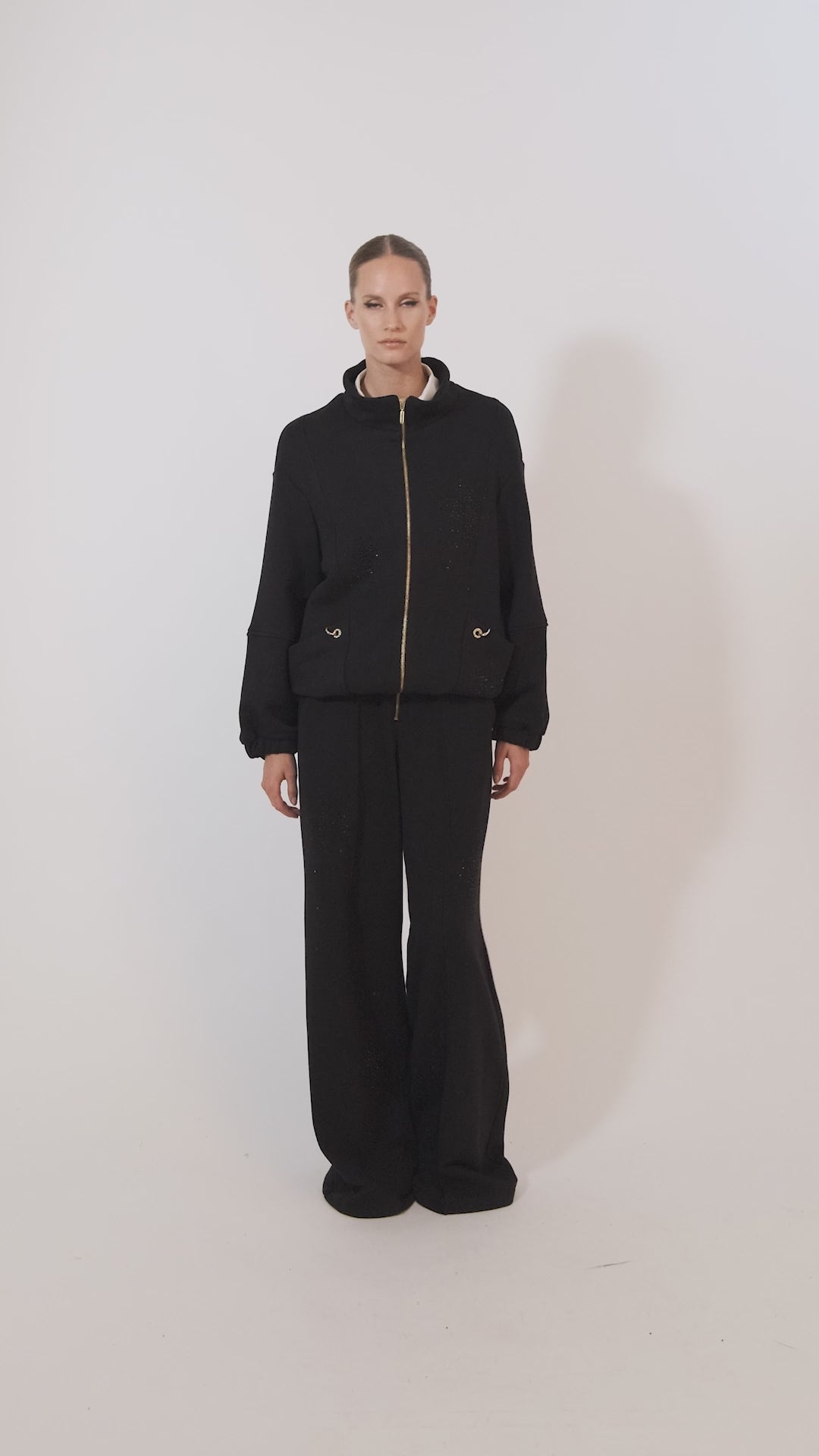 These sweatshirt trousers are loose and long, made 100% of cotton. They have an elastic band on the waistline and a zipper. They also have a front seam, back pockets and strass on the front.