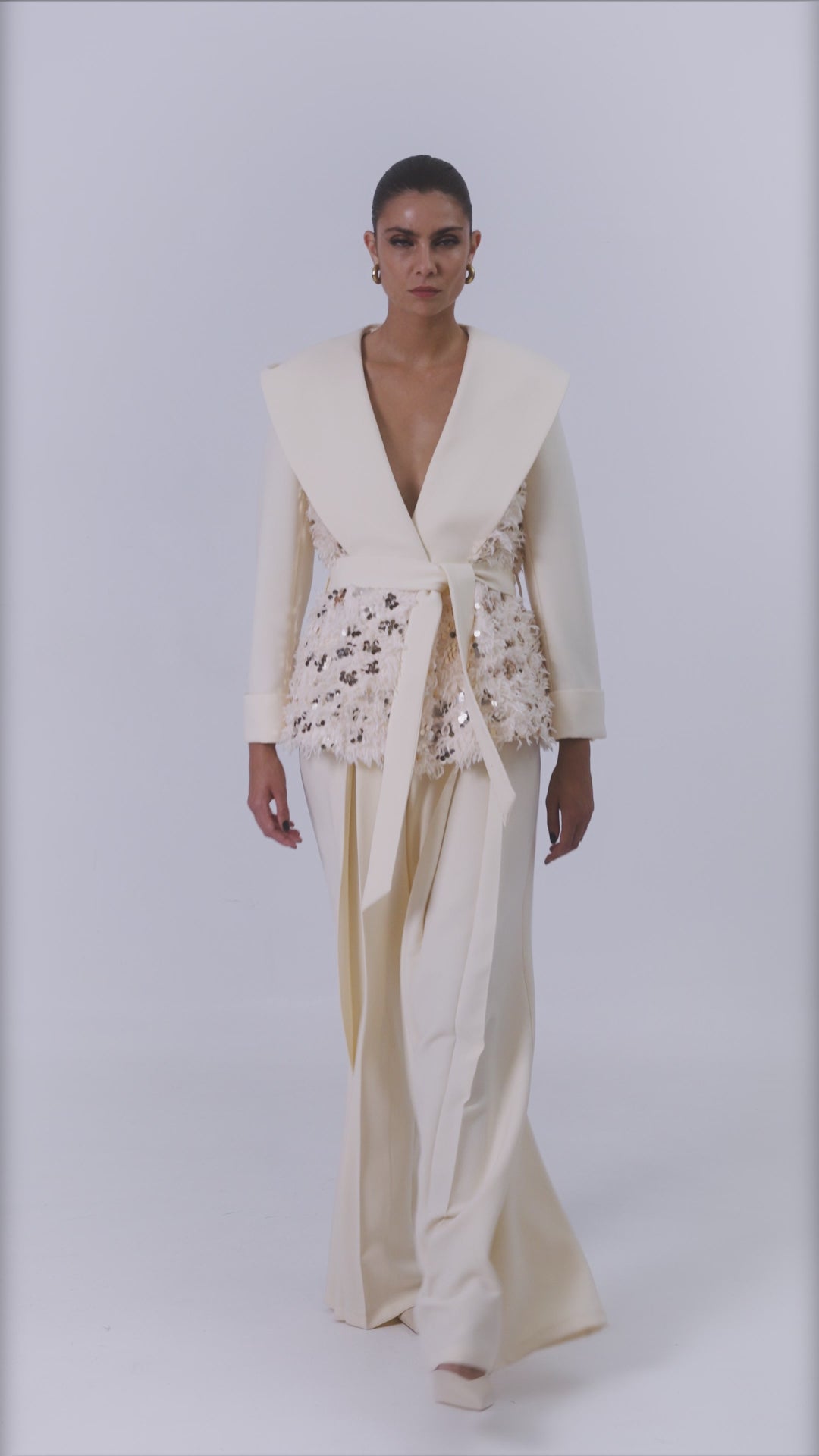 Cruise blazer with sequin features that fastens with belt, made from crepe fabric.