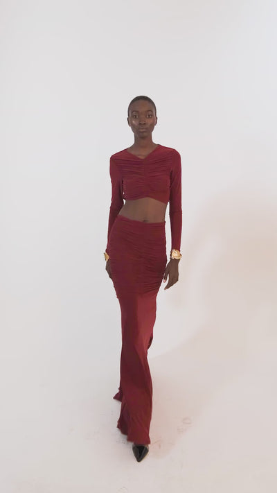 Αποτελείται από μάξι φούστα με πτυχώσεις και ίδιο στυλ μακρυμάνικο crop top. Πολύ ελαστικό ύφασμα, που κολακεύει όλους τους σωματότυπους.