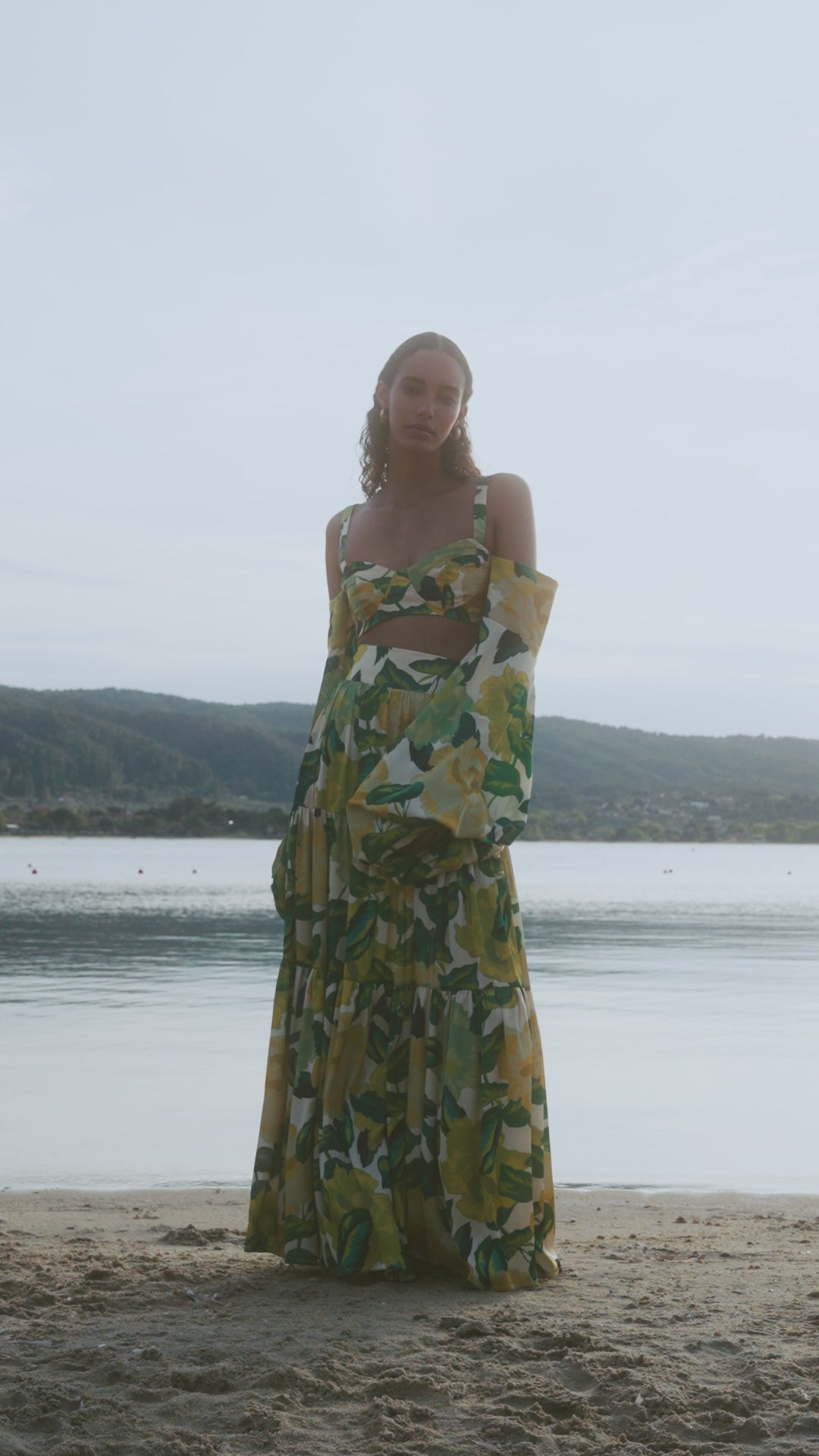 This set consists of a top and a skirt. The top has a bustier, straps and long and wide sleeves. The skirt is maxi, loose, high-waisted, with a side zipper.