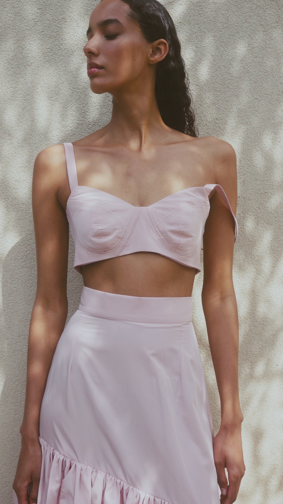 This matt light taffeta fabric exudes an air of luxury and sophistication. The minimalistic crop top bustier has straps and fastens on the back with a bow. The ravishing long skirt has ruffles on it's endings and a leg opening. Both visually stunning and comfortable to wear.