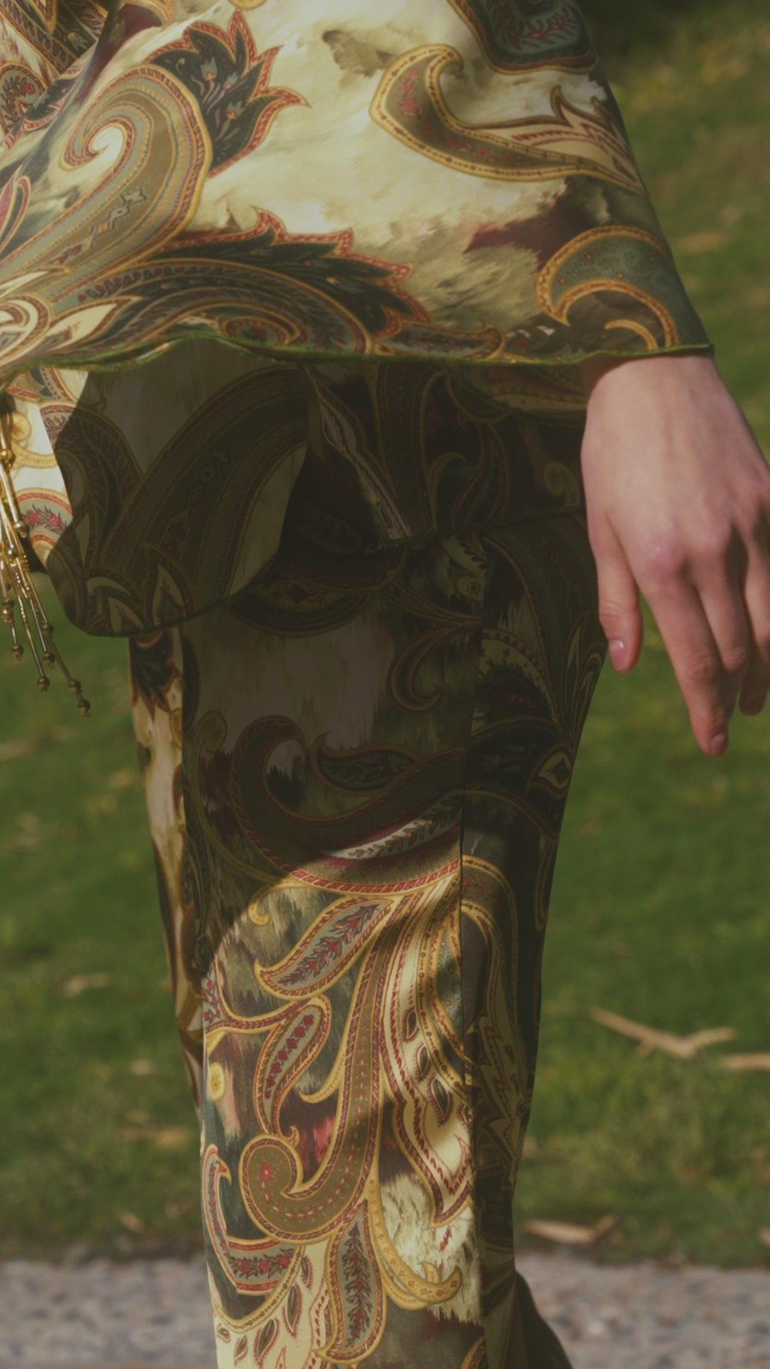 Showcase your look with this stunning set. The blouse features wide sleeves and gold fringe at the collar, adding a touch of luxury and uniqueness. Its lightweight and comfortable fabric makes it ideal for any time of the day. The set includes a high-waisted, androgynous-style pant with a vibrant, multicolored pattern, perfect for both special occasions and everyday wear.
