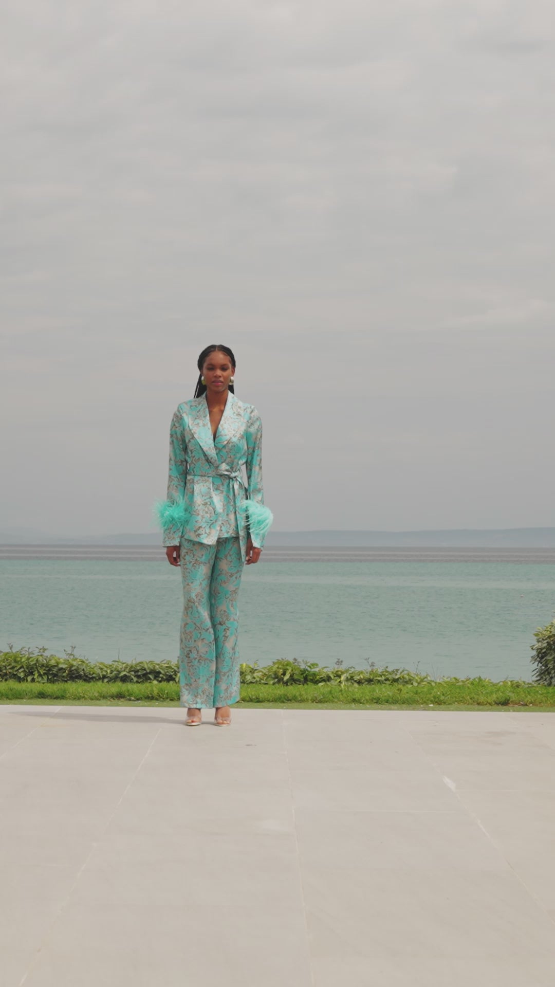 Costume set of blazer with feather features combined with straight-leg pants, made from silk touch fabric.
