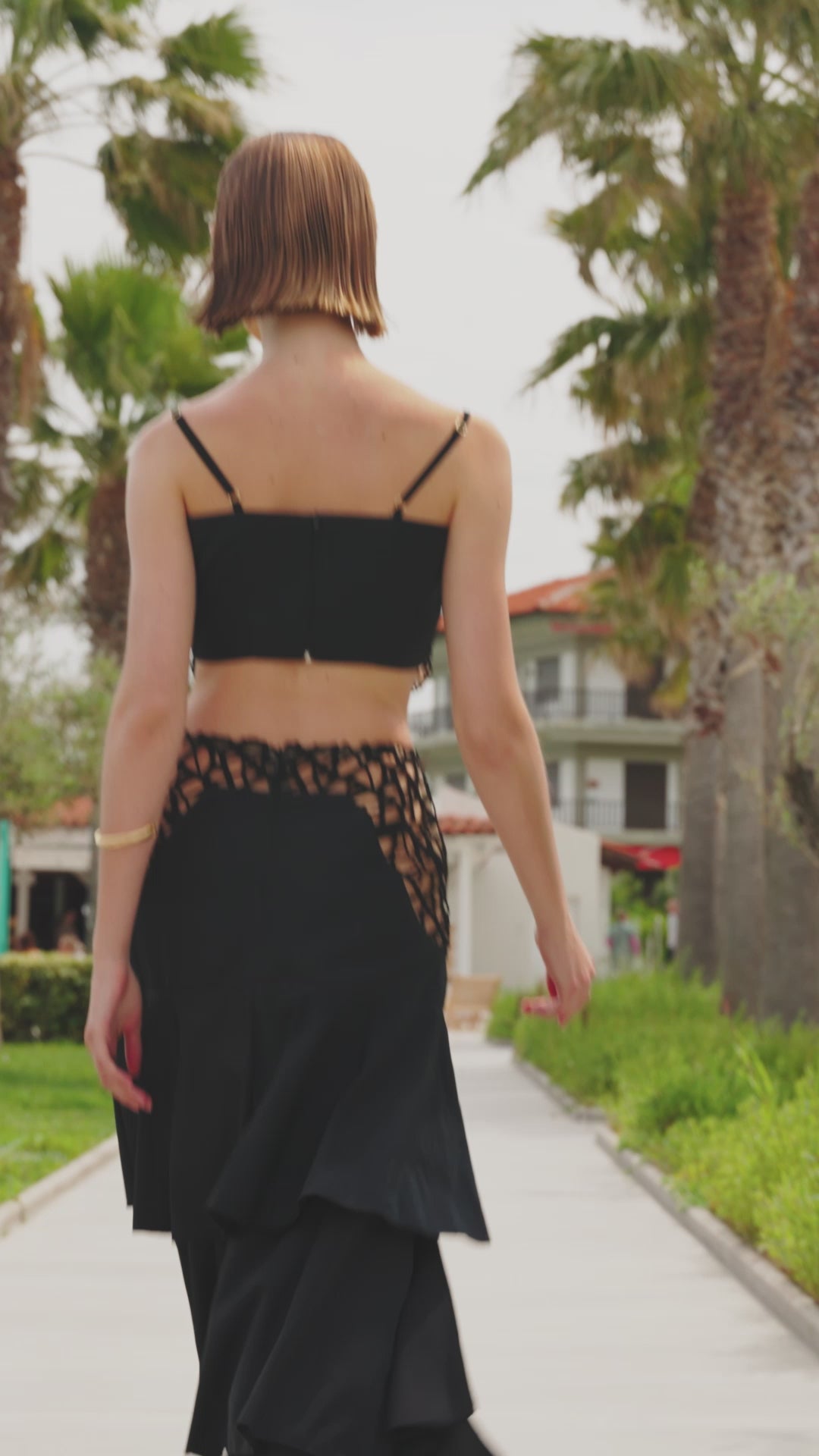 Set top with adjustable straps combined with maxi skirt with ruffles, made from taffeta fabric.