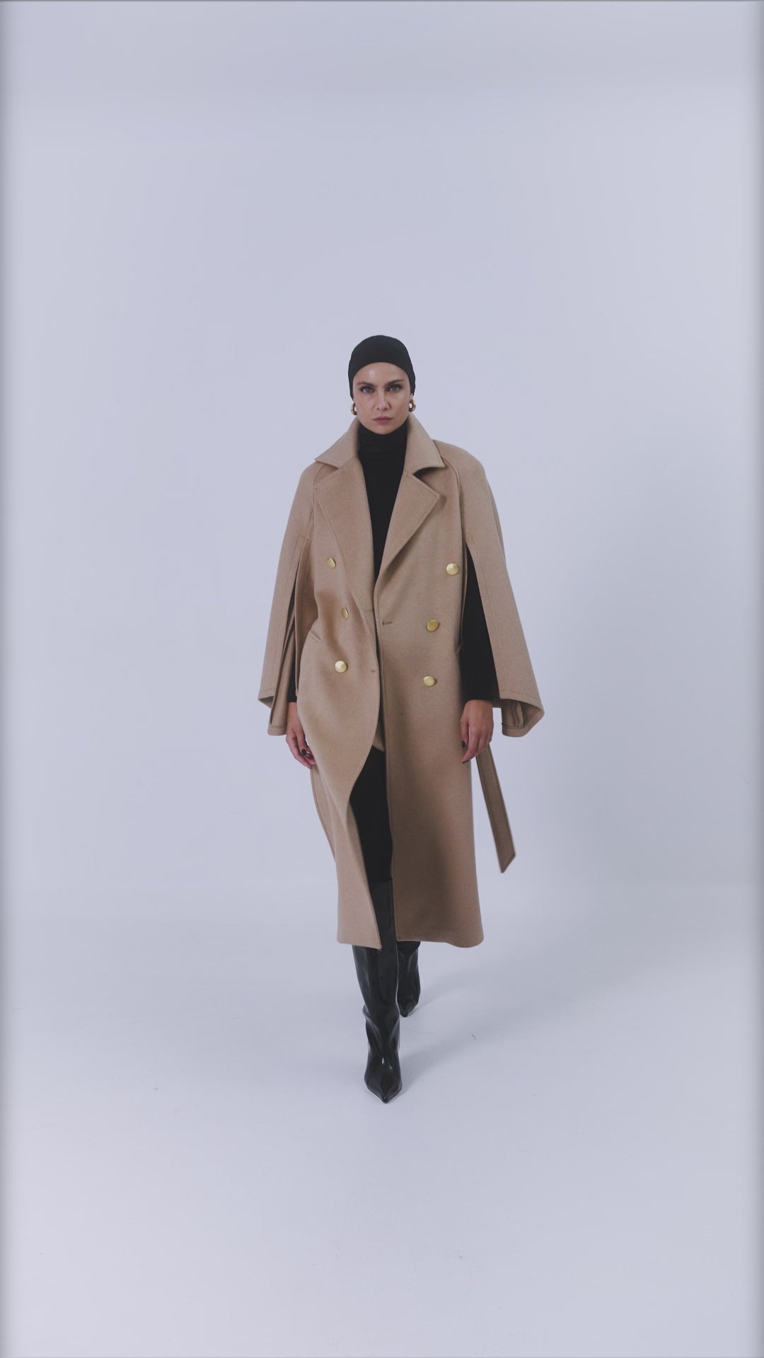 Coat with open sleeves, made from fabric composed of 60% Cashmere and 40% polyester.